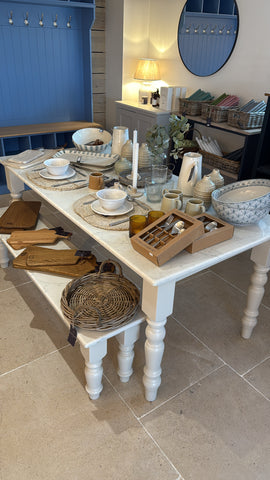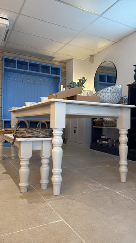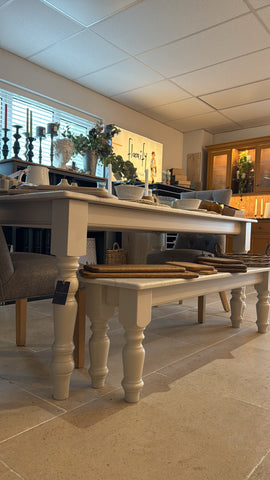 6ft table with matching quartz bench which slots neatly under the table. Dining Chairs are not included but can be added to your order. Painted in Portland Stone Light with White Carrara Quartz top.