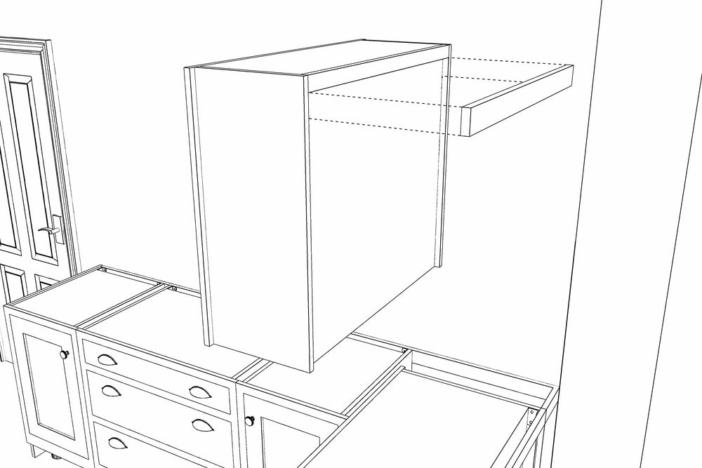 Fit the adjacent unit in the same manner. Remove the door or drawers from one of the units and drill through the frame sideways. Fix the units together through the frame with a screw. If removing a door hinge, screw behind the removed hinge.
